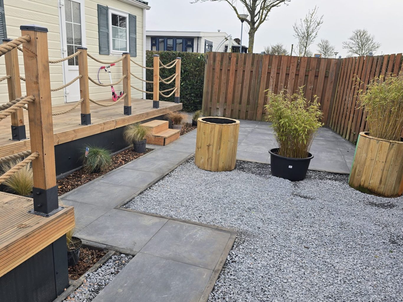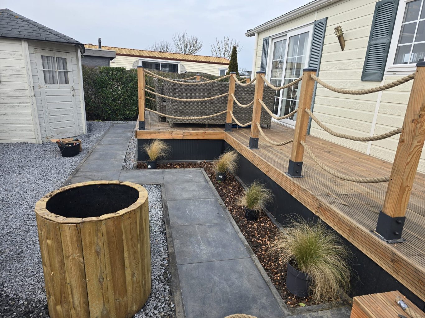 Neubau einer Hochterrasse aus Holz, Anlage eines Steinbeets inkl. Gehweg